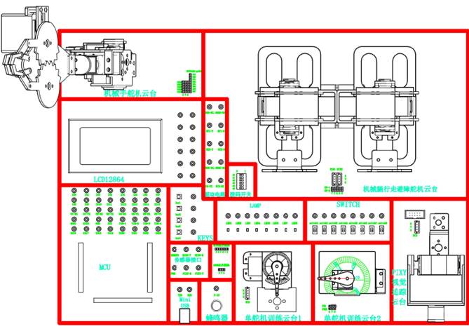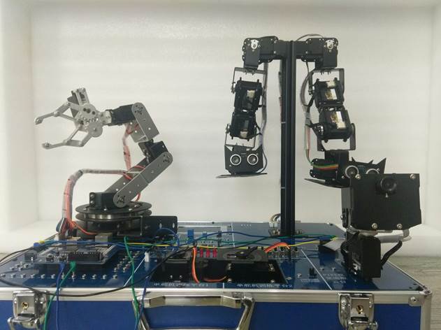 EL-IBrobot型教学实验系统是属于一种机器人原理教学实验系统,它包括嵌入式CPU、功率驱动、舵机控制、机器人传感与通信、头部控制、机器人手臂、机器人腿部控制等几部分,该平台支持EXP-89S51、EXP-STM32F107、EXP-STM32F407等CPU板,实现了多模块的应用实验。它是集单片机、机器人用舵机、常用传感器的学习、应用编程、开发研究于一体的多功能创新平台。实验箱上除了可以用来学习单片机基础入门操作外,还可以用来学习PWM标准舵机和串行总线舵机的控制协议以及各种常见传感器的使用。试验箱有搭配了MPU6050六轴运动传感器的5个自由度机器人机械手舵机云台、搭配有两个HY-SRF05超声波测距模块的8个自由度机器人机械腿行走避障舵机云台、搭配了Pixy CMUcam5 图像识别传感器的2个自由度机器人视觉追踪舵机云台以及两个用于对串行总线舵机和PWM标准舵机的单舵机训练云台等五个云台,以及拓展了LCD12864液晶显示模块、1838红外接收和HC-05蓝牙遥控模块,可以完成基于CPU硬件资源的基础性实验、基于两种舵机的人形机器人肢体控制实验以及外拓传感器实验等等。 |