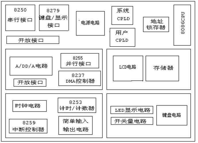 为了提高微机教学实验质量,提高实验效率,减轻主讲教师和实验教师的劳动强度,在该系统的实验板上,除微处理器、程序存储器、数据存储器外,还扩展了8255并行接口、8250串行控制器、8279键盘、显示控制器、8253可编程定时器、A/D、D/A转换、单脉冲、各种频率的脉冲发生器、输入、输出电路等模块,各部分电路既相互独立、又可灵活组合,能满足各类学校,不同层次微机实验与培训要求。能够完成《微机原理与接口》课程教学大纲中所规定的所有实验,并增加了CPLD地址译码实验,主要包括: