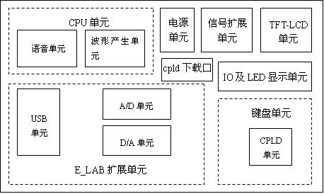 EL-DSP-E300型DSP系列实验开发系统由DSP CPU板、TFT-LCD单元、键盘输入单元、A/D转换单元、D/A转换单元、USB单元、语音单元、8路开关量输入输出和8个LED数码管显示输出单元、信号扩展单元、波形产生单元、CPLD逻辑单元、及E-lab扩展总线组成。如右图示 |