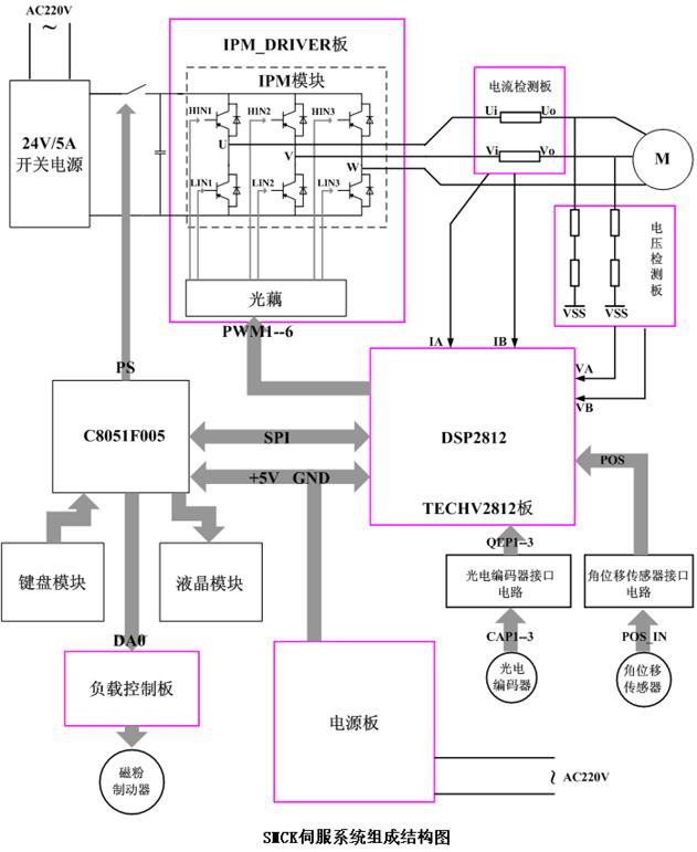 1、产品结构及特点(参考SMCK伺服系统组成结构图) ⑴ 实验箱总体上采取在一块主电路板上插接其他小功能电路板的组成形式,主电路主要完成信号的链接,人机接口,及PWM信号,CAP信号,电压电流反馈信号测量的功能。 ⑵ 核心控制部件是DSP的CPU板,直接插接到SMCK实验箱上,控制功率部件,接受反馈信号,及与主电路板上的单片机通信。其输出的PWM信号及接收的速度脉冲信号已引到主电路板上,可以很方便的测量。目前有TMS320C2812一种CPU控制板。 ⑶ 功率部分是IPM_DRIVER功率转换板,直接插接到SMCK实验箱上,功率器件采用国际整流器IR公司的IPM模块IRAMS10UP60B-2,板上通过光藕器件与DSP隔离,还附带测试孔,能方便测试光藕后的PWM波形。 ⑷ 电流电压信号检测部分是SMCK_AS信号检测板,直接插接到SMCK实验箱上,能实时监测功率模块输出的电流及电压信号,并将其转换为弱电信号,反馈回主电路板及DSP,客户可以在主电路板上方便的测量反馈信号,也可以利用其反馈信号开发DSP控制算法。 ⑸ 人机接口部分位于主电路板上,由显示屏、触摸按键及给定电位器组成。显示屏采用320*240点阵、5.2寸单色液晶,操作界面更友好,观察信息更方便,并可以完成速度信号动态曲线描绘,使系统性能表现的更直观。给定电位器能完成电机的连续跟踪的给定任务。人机接口和磁粉制动器以及其他辅助控制功能由主电路板上的一个单片机进行控制,不占用DSP的处理时间。 ⑹ 电源部分在实验箱内部,控制电源与功率电源分别供电,功率电源采用一个24V/5A的开关电源,满足电机功率要求,24V电源干扰少,有短路自保护,可靠且安全。 ⑺ 控制对象包括24V直流伺服电机(加减速器)、步进电机、磁粉制动器、光电编码器、角位移传感器,它们都是通过电缆与实验箱主电路板连接的。不同的电机机组组成形式有所不同。直流有刷永磁电动机采用欧姆龙公司的1000线增量式旋转光电编码器,直流无刷电机采用电机内部的霍尔信号传感器,三相步进电机不接测速装置。见右侧的机组示意图。 | ![]()